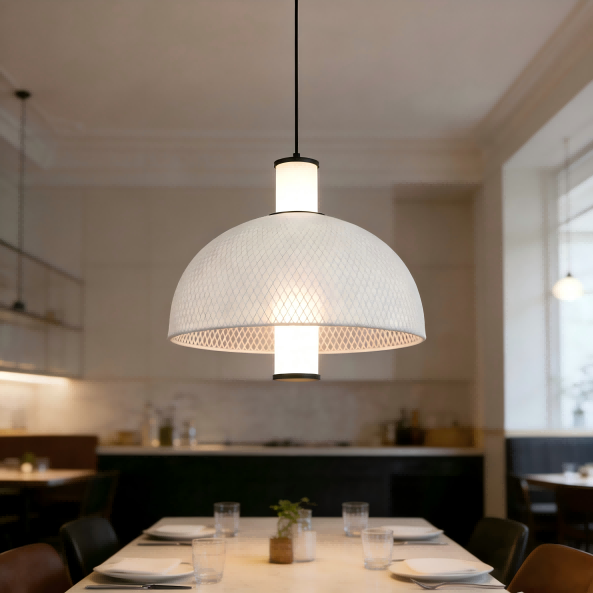 Inspirado nas tendências de design de ponta da exposição Euroluce de Milão de 2025, este candeeiro suspenso minimalista em malha de seda italiana da Strong Lighting combina perfeitamente o minimalismo italiano com a funcionalidade prática. A fonte de luz LED central de 15W emite uma luz neutra de 4000K, criando uma atmosfera confortável. Com um brilho de 1500LM e um alto índice de reprodução de cores de Ra>80, a luz é natural e realista, tornando-a adequada para salas de estar, salas de jantar e outros espaços. O abajur redondo em forma de arco é feito de malha de ferro enrolada em tecido de seda branca, e as ferragens pretas foscas são finalizadas com um processo de pintura em spray para adicionar textura. O design simples integra-se facilmente em estilos domésticos nórdicos, modernos e outros.